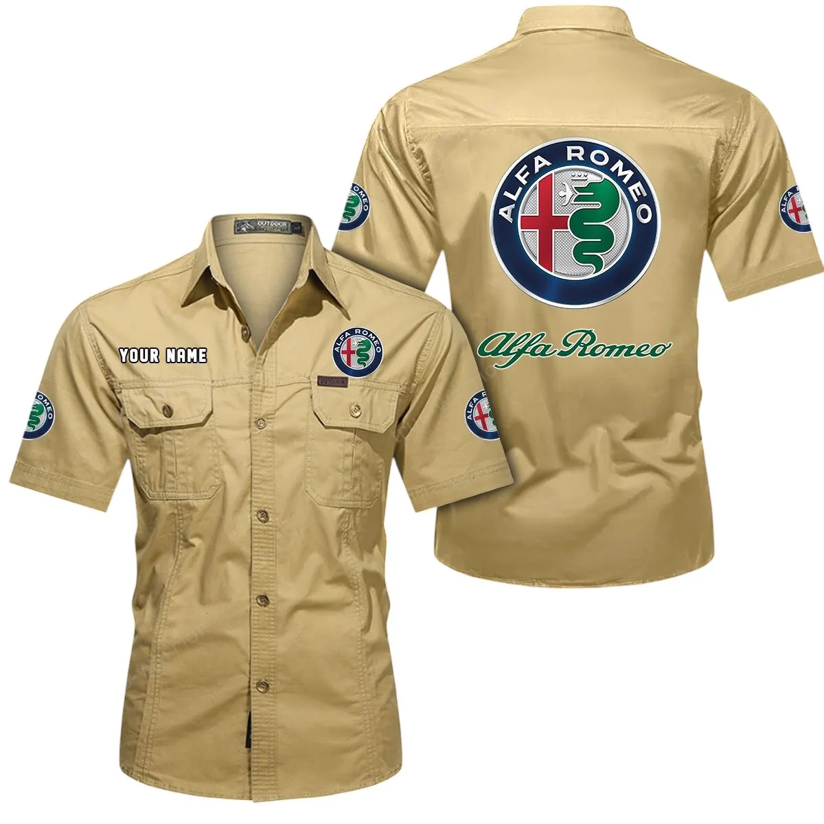Alfa Romeo Short Sleeved Shirt, All Over Print Button Shirt CAR444052625827 – Khaki