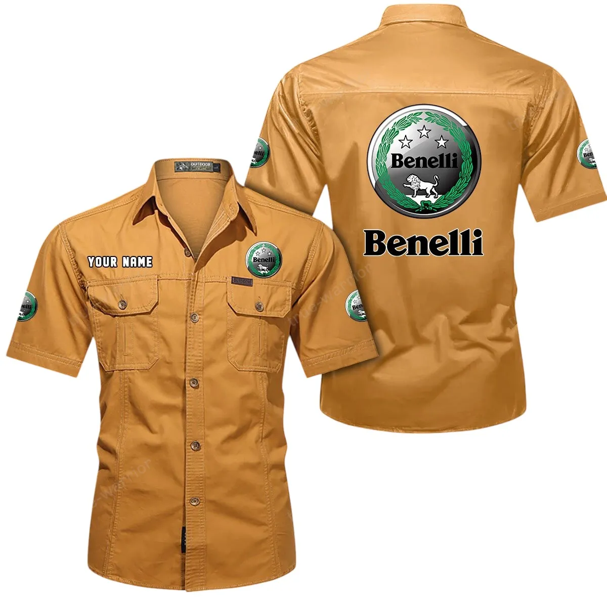 Benelli Motorcycles Short Sleeved Shirt, All Over Print Button Shirt CAR444052625782 - Khaki