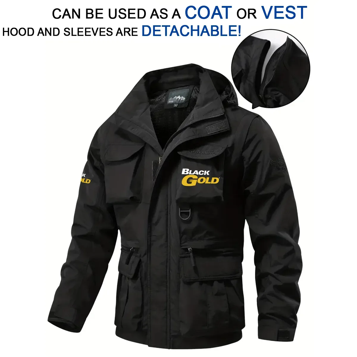 Black Gold Sights Exclusive Logo Waterproof Multi Pocket Jacket Detachable Hood and Sleeves OUHUMPJ0815BDZ – Black Gold Sights Gift