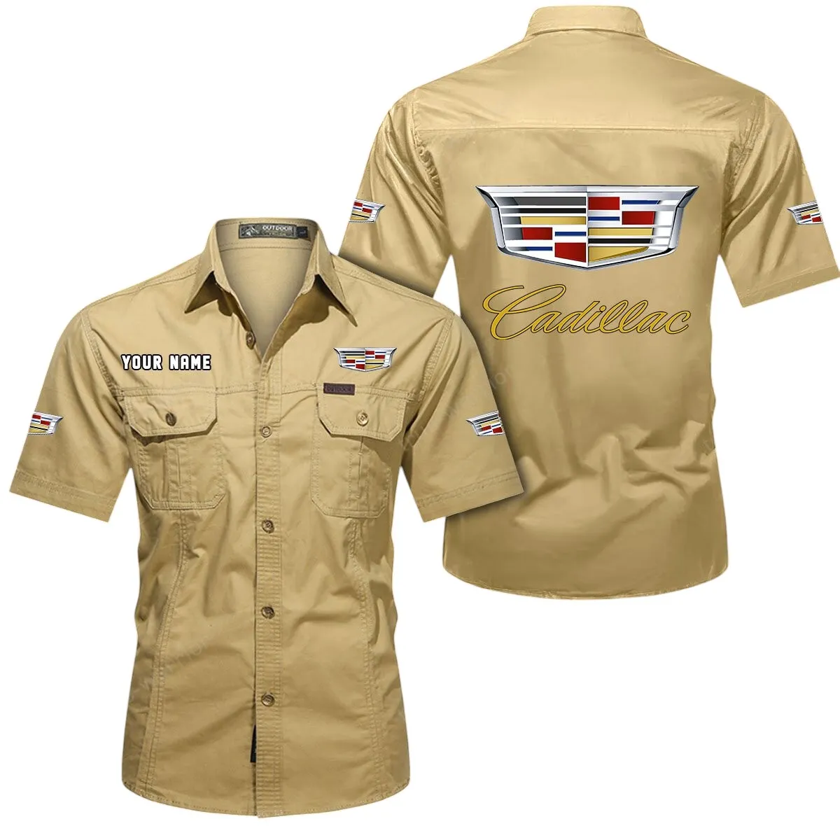 Cadillac Short Sleeved Shirt, All Over Print Button Shirt CAR444052625816 – Khaki