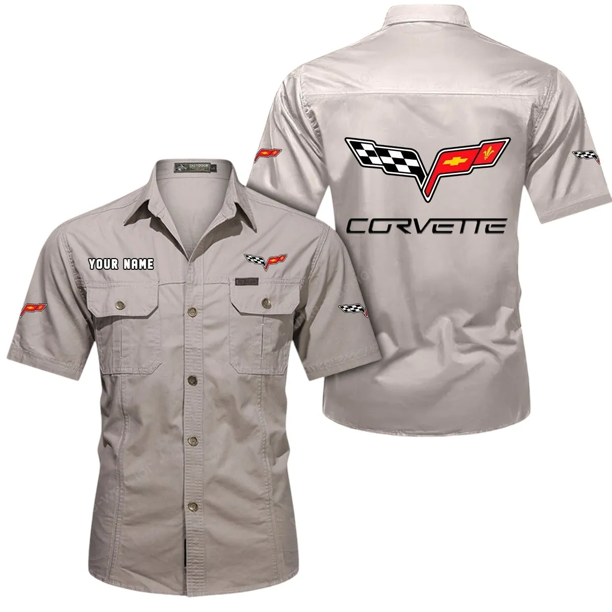 Corvette C6 Short Sleeved Shirt, All Over Print Button Shirt CAR444052625856 - Khaki