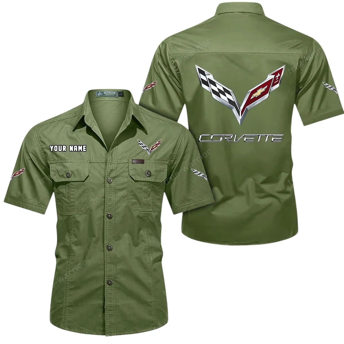 Corvette C7 Short Sleeved Shirt, All Over Print Button Shirt CAR444052625779 - Army Green