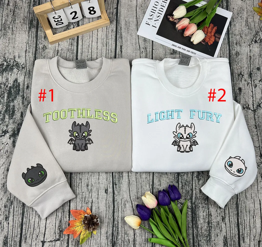 Couple Toothless And Light Fury Embroidered Sweatshirt Fashion Style For Couples, Valentines Gift For Him/Her