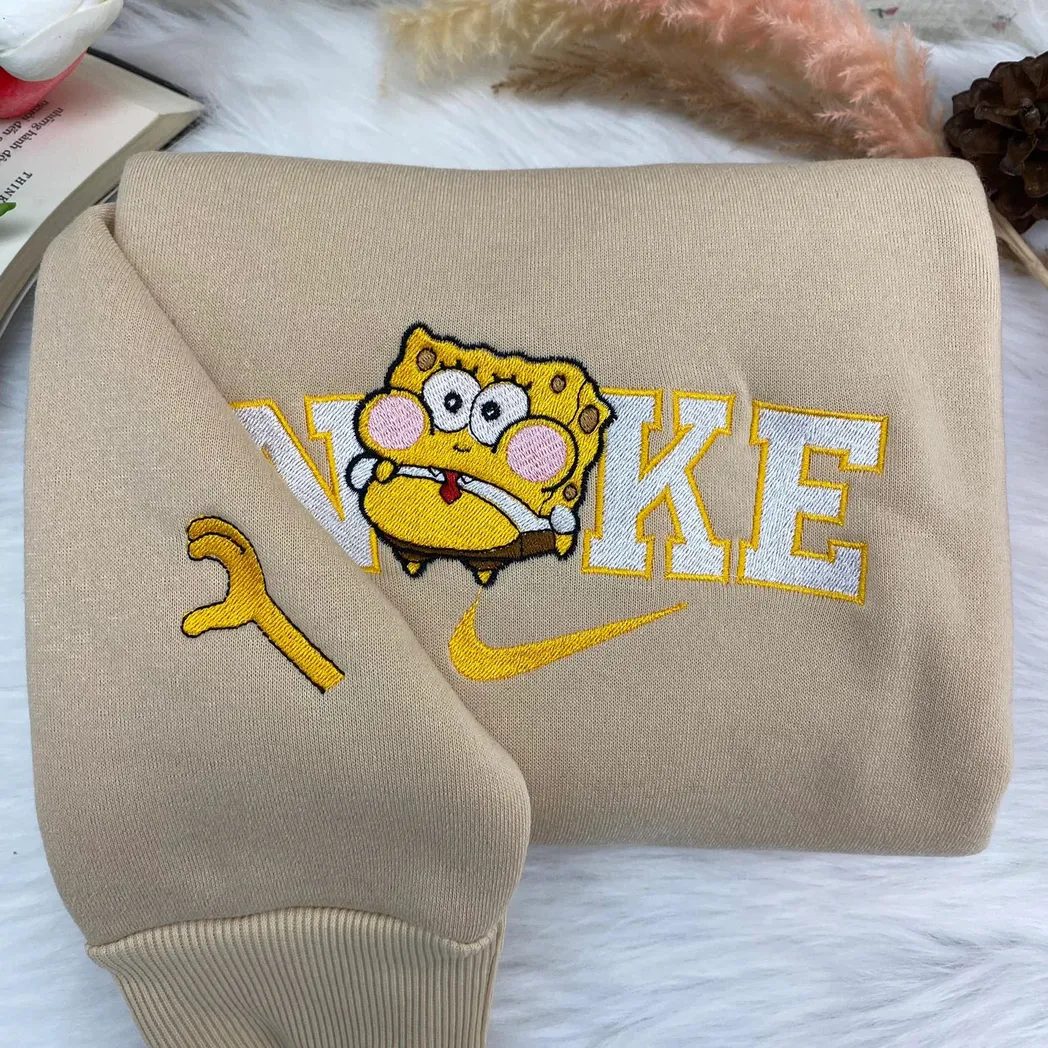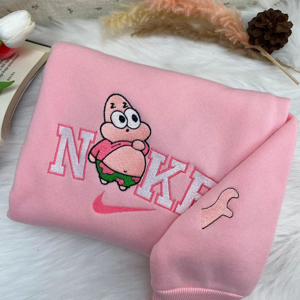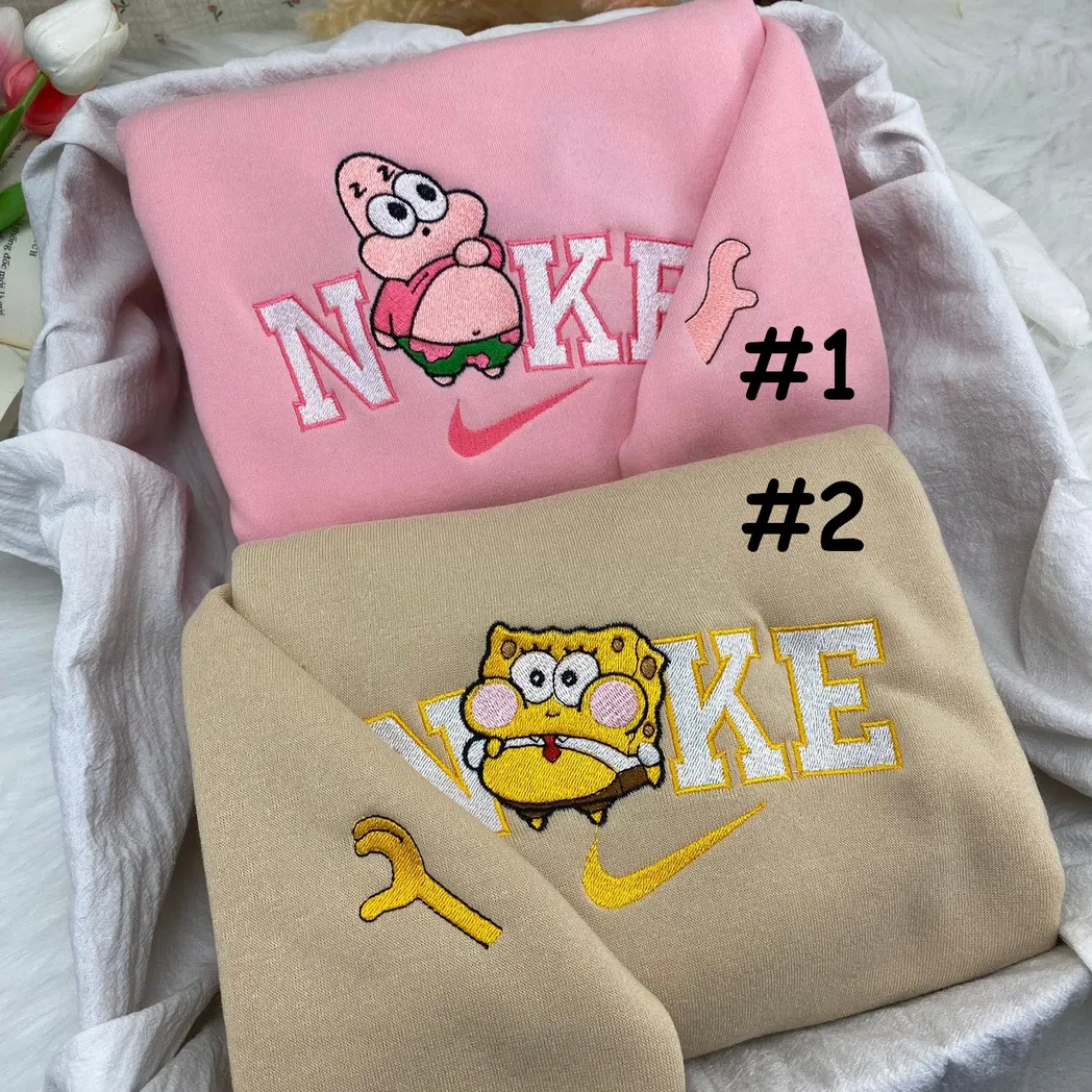 Cute Chibi Patrick Star And SpongeBob SquarePants Cartoon Nike Embroidered Sweatshirt Fashion Style For Couples, Valentine’s Day