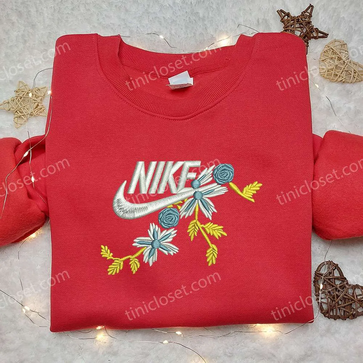 Flowers x Nike Embroidered Shirt, Gift For Wife Embroidered Shirt, Custom Nike Embroidered Shirt