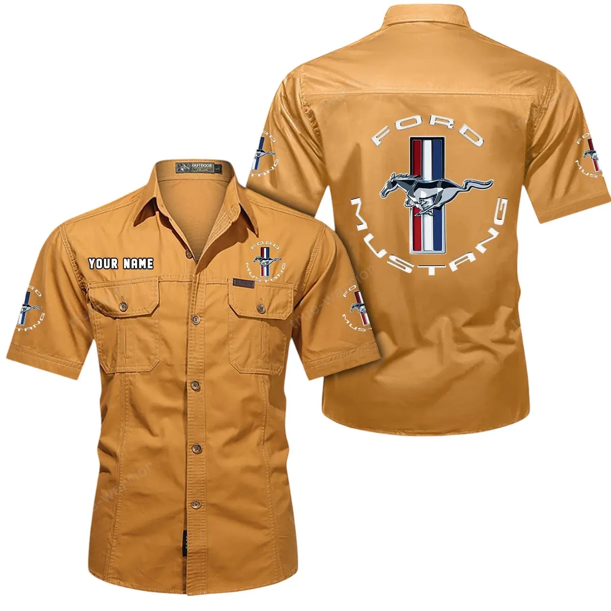 Ford Mustang Short Sleeved Shirt, All Over Print Button Shirt CAR444052625781 - Khaki