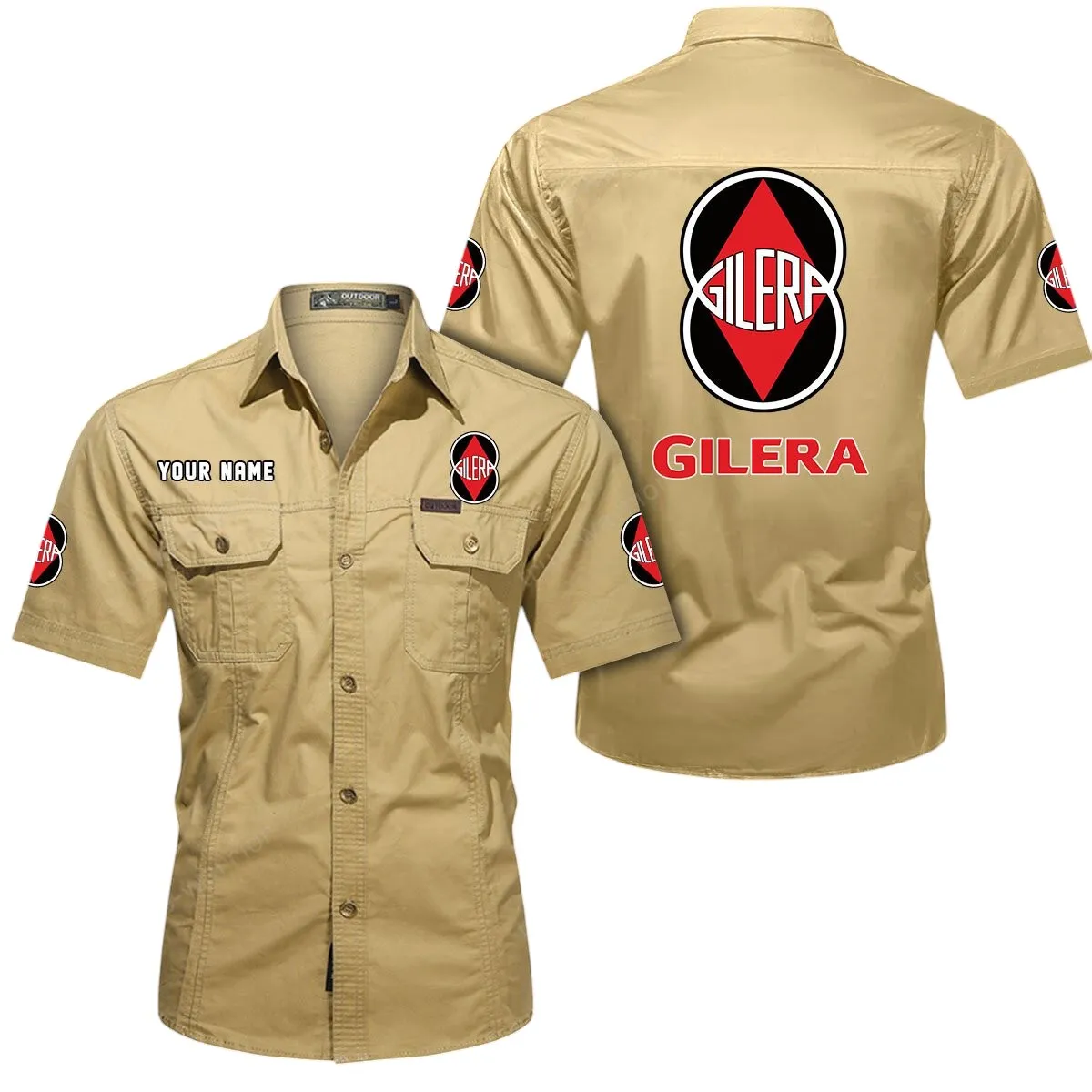 Gilera Motorcycles Short Sleeved Shirt, All Over Print Button Shirt CAR444052625844 - Khaki