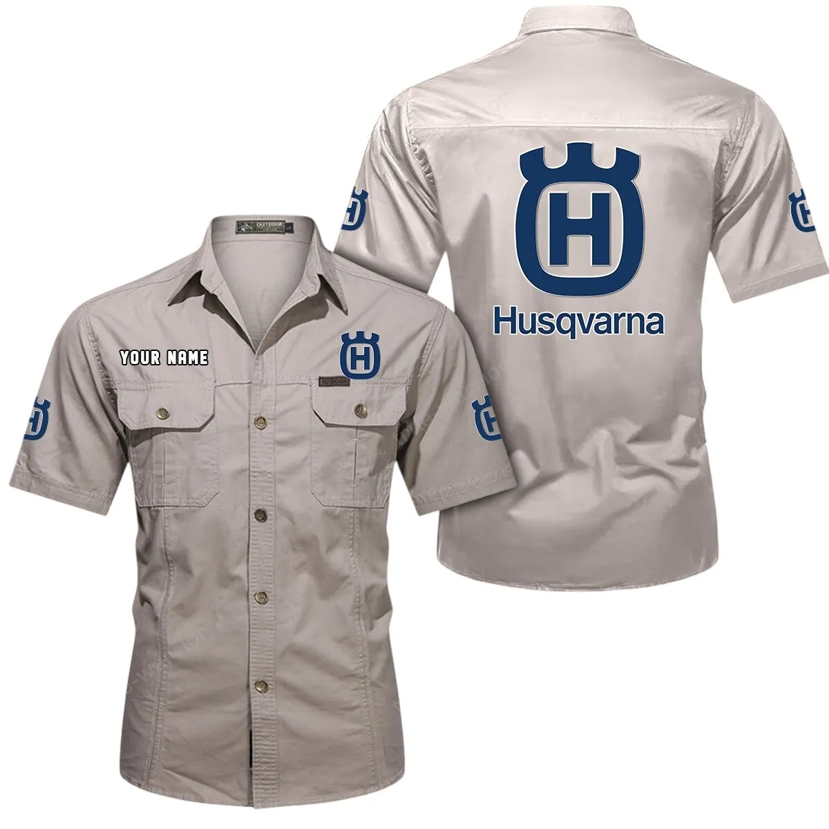 Husqvarna Motorcycles Short Sleeved Shirt, All Over Print Button Shirt CAR444052625797 – Beige