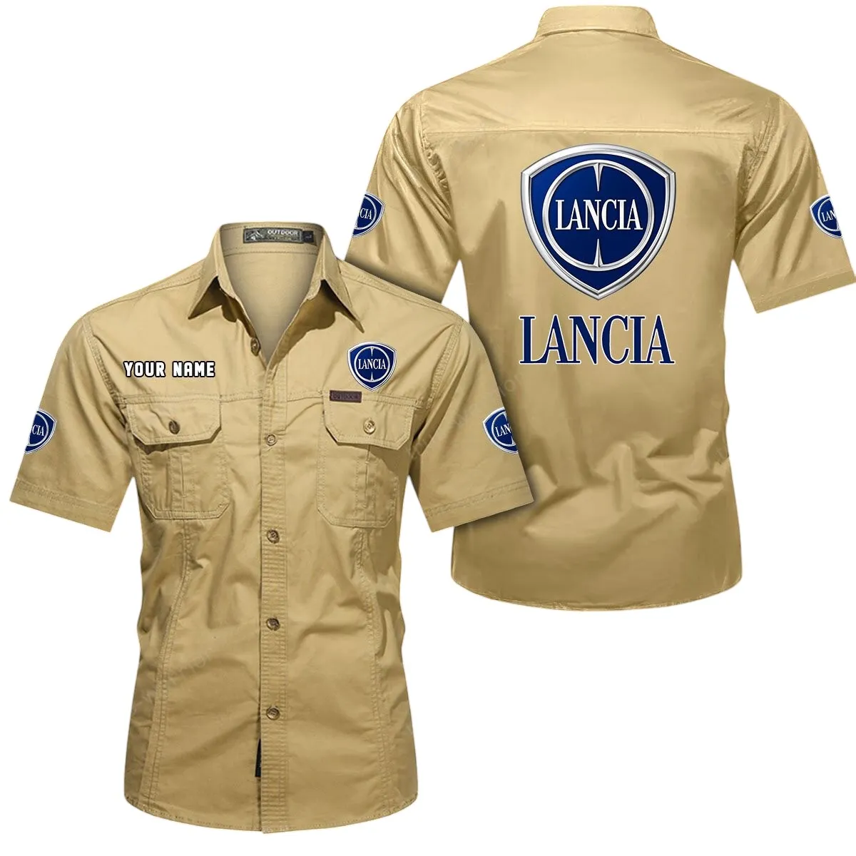Lancia Short Sleeved Shirt, All Over Print Button Shirt CAR444052625963 – Khaki