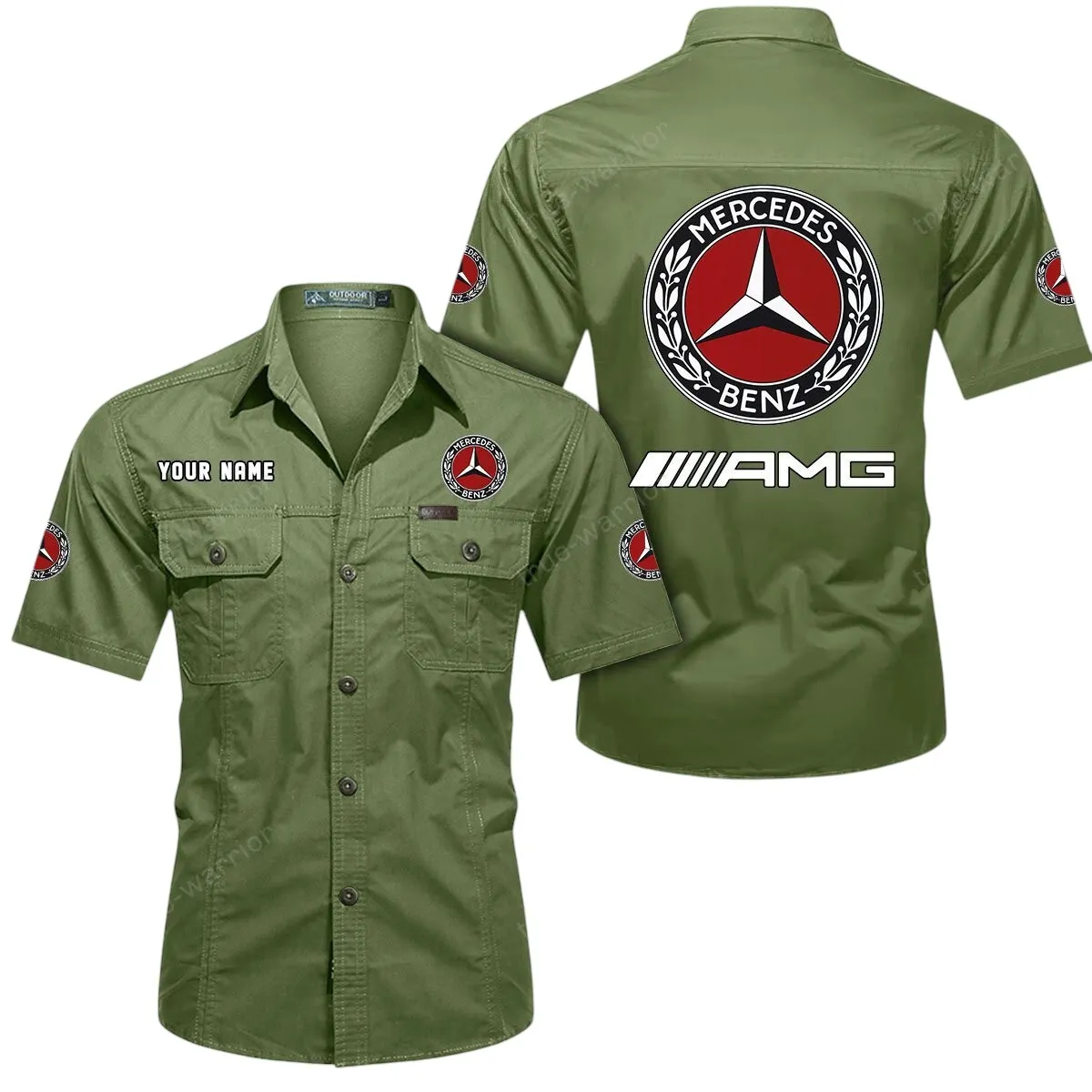 Mercedes AMG Short Sleeved Shirt, All Over Print Button Shirt CAR444052625841 - Army Green