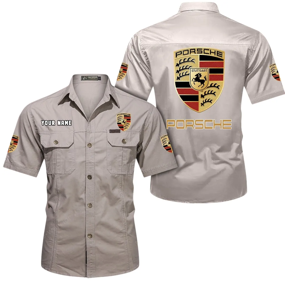 Porsche Short Sleeved Shirt, All Over Print Button Shirt CAR444052625823 - Khaki