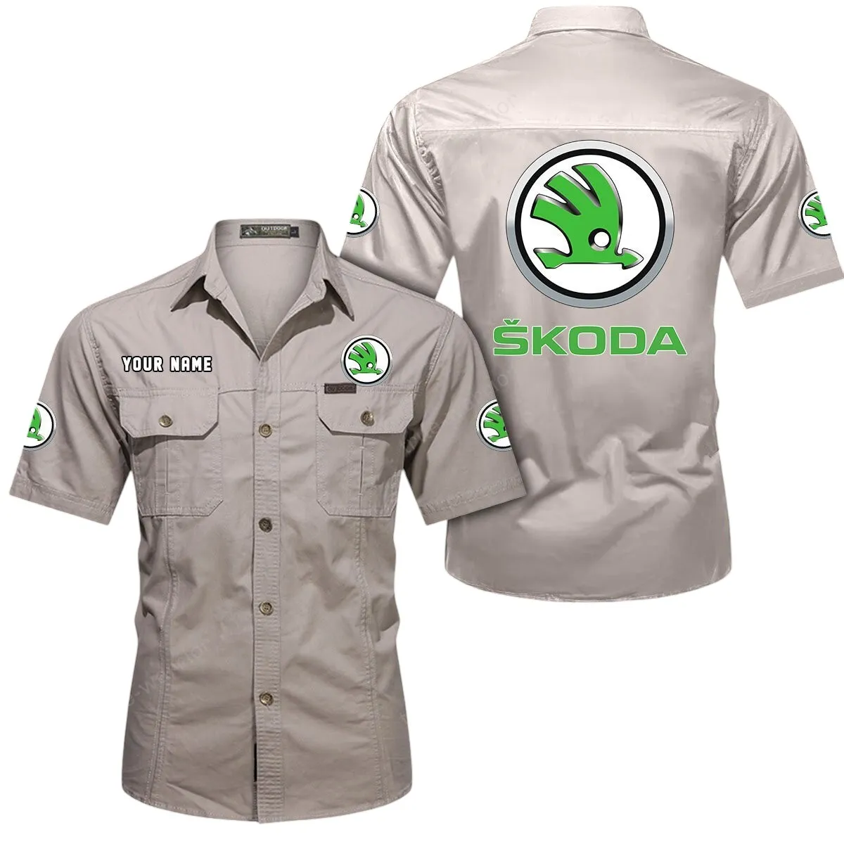 Skoda Auto Short Sleeved Shirt, All Over Print Button Shirt CAR444052625901 - Khaki