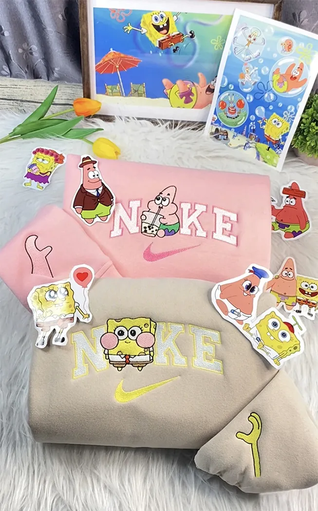 SpongeBob SquarePants And Patrick Star Cartoon Nike Embroidered Sweatshirt Fashion Style For Couples, Valentine’s Day